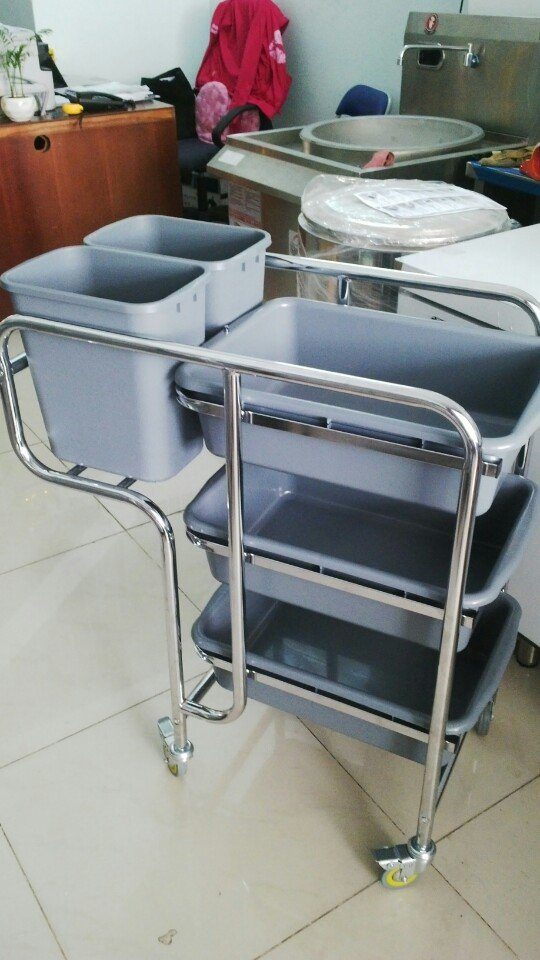 Xe thu dọn thức ăn D-016 được cấu tạo gồm 3 tầng, 5 xô bằng nhựa và thép không rỉ, các xô nhựa có thể tháo rồi ra được dễ dàng vệ sinh,