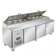 Bàn pizza được kết cấu toàn bộ bằng inox, phía trên có 10 khay để nguyên liệu làm pizza luôn được làm mát giúp nguyên liệu tươi ngon.